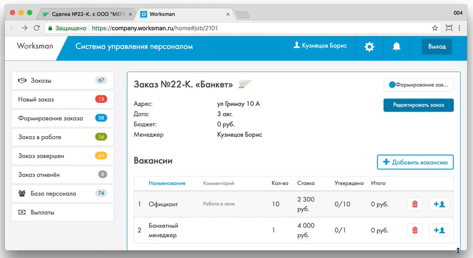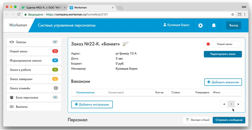 Worksman - это система для управления отношениями с выездным персоналом. Позволит управлять базой, наладить коммуникации с персоналом по заказам, сделает прозрачной систему оплат. Это про отношения с персоналом