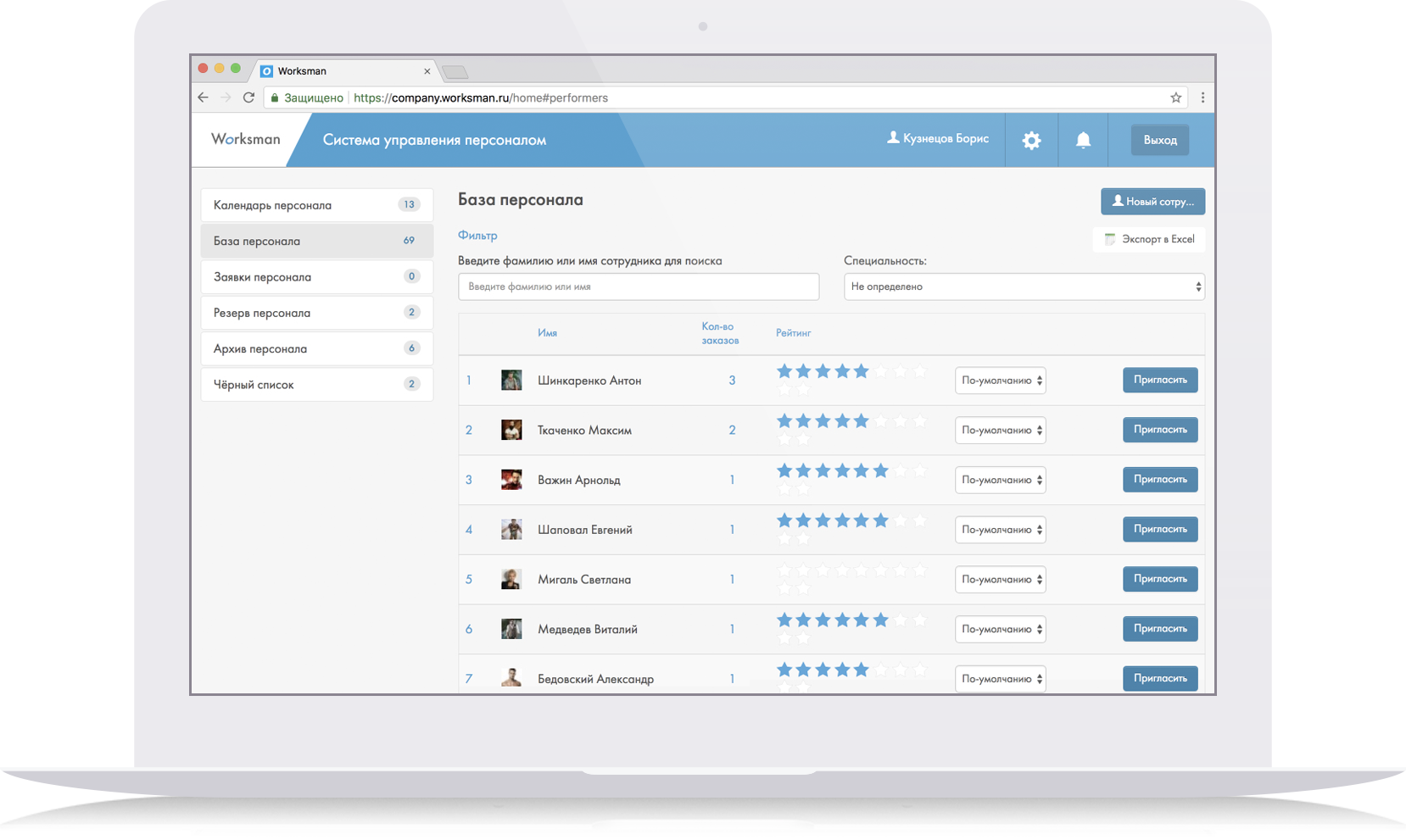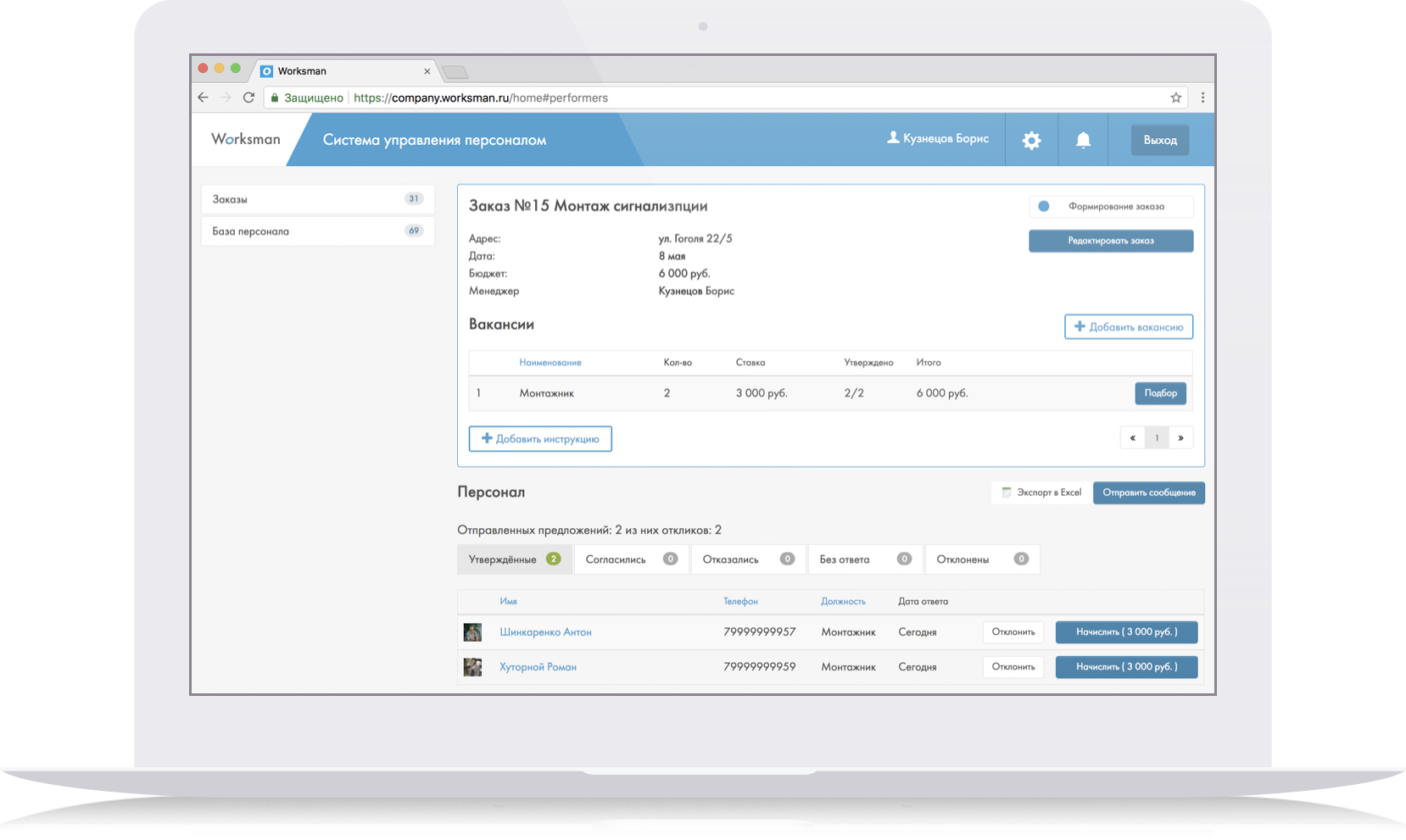 Мы владельцы компании BAR-STREET и уже 8 лет занимаемся кейтерингом. Мы создали Worksman для себя, чтобы упростить и упорядочить работу выездных сотрудников. В нашей системе работают более 300 человек: 5 менеджеров, 90 официантов, 240 барменов и др.