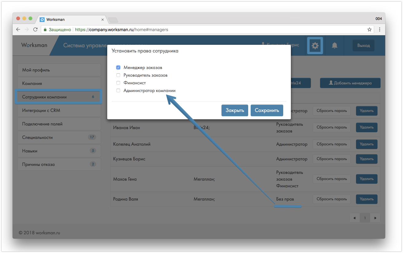 Далее Вы можете выбрать права для каждого сотрудника из списка: